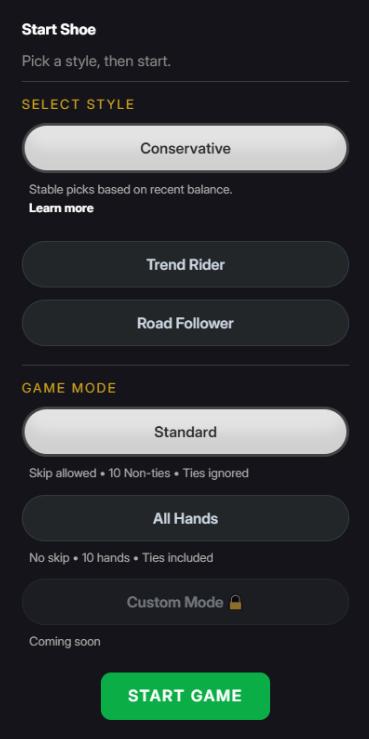 Learn moreA system-based decision tool that analyzes shoe progression patterns and applies predefined structured logic depending on your selected play style.